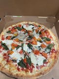 Tomato sauce,fresh tomatoes basil, mozzarella, aged romano cheese, drizzled with olive oil.