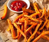 Sweet potato fries! Wedges of sweet potatoes, tossed with oil, sprinkled with spices, and baked on high heat until browned and crispy at the edges.